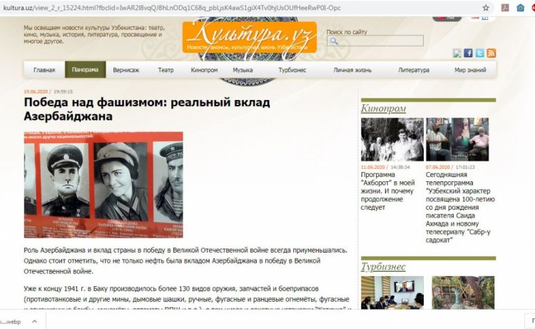 Özbəkistanın kultura.uz portalında “Faşizm üzərində qələbə: Azərbaycanın real töhfəsi” sərlövhəli məqalə verilib.