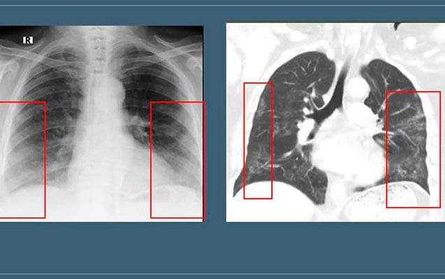 Qeyd edək ki, “buzlu şüşə” görüntüsü döş qəfəsinin rentgenoqrafiya və KT müayinələrində aşkar edilir. Lakin bu məsələdə rentgenoqrafiya müayinəsinin həssaslığı aşağıdır. Ona görə də yoluxmanın ilk 1-4 günlərində rentgenoqram 25% hallarda tam normal ola bilər. Bu, pnevmoniyanın olmaması demək deyil. “Buzlu şüşə”nin KT müayinəsində görülməsi daha spesifikdir (Şəkildə eyni xəstənin rentgenoqrafiya və KT müayinələrində buzlu şüşə görüntüsünün təsviri verilib).