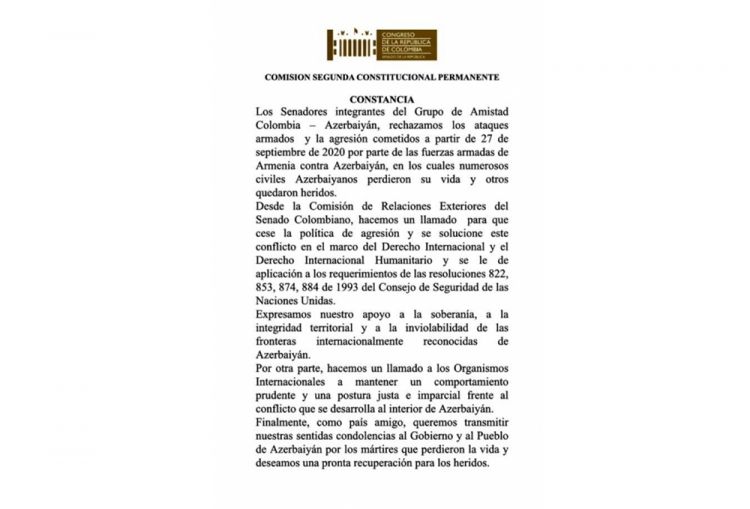 Kolumbiya Senatının Xarici Əlaqələr daimi Komissiyası bu gün qəbul etdiyi bəyanatda sentyabrın 27-dən etibarən Ermənistan silahlı qüvvələrinin Azərbaycana qarşı törətdiyi və mülkü əhali arasında itkilərə səbəb olan hücumları və təcavüzü pisləyib, eləcə də ölkəmizin suverenliyi, ərazi bütövlüyü və beynəlxalq qaydada tanınmış sərhədlərinin toxunulmazlığına dəstəyini bir daha ifadə edib.