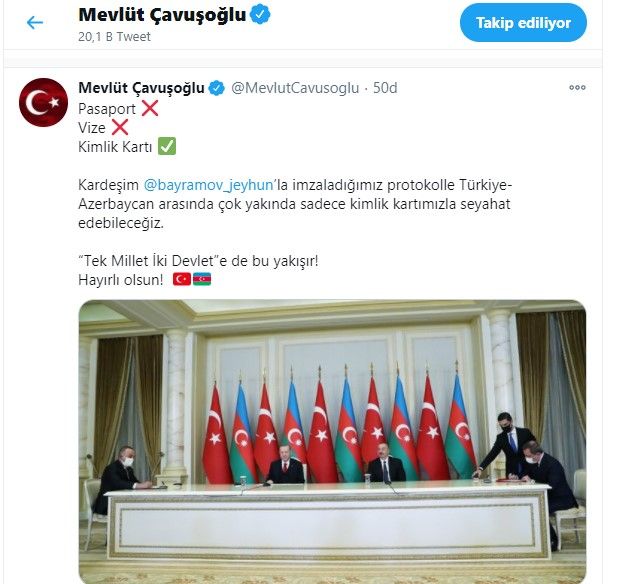 “Qardaşım Ceyhun Bayramov ilə imzaladığımız protokolla Türkiyə-Azərbaycan arasında çox yaxında sadəcə şəxsiyyət vəsiqələrimizlə səyahət edə biləcəyik. “Bir millət, iki dövlət”ə elə bu yaraşar! Xeyirli olsun”, - o qeyd edib.
