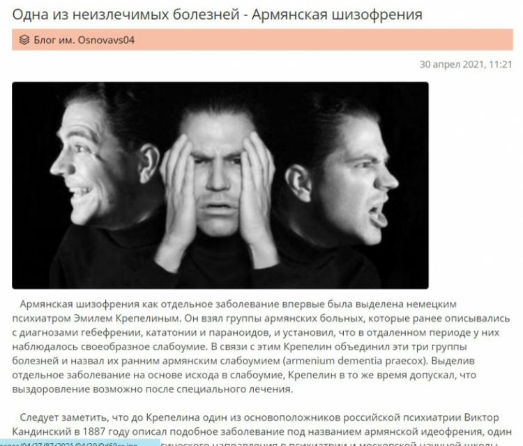 NUHÇIXAN İnformasiya Agentliyi məqaləyə istinadla xəbər verir ki, erməni şizofreniyası ayrıca bir xəstəlik kimi ilk dəfə alman psixiatrı Emil Krepelin tərəfindən müəyyən edilib. O, əvvəllər gebefreniya, katatoniya diaqnozu qoyulan xəstələri, paranoidləri müşahidə edərkən belə qənaətə gəlib ki, ermənilərin hamısında ayrı-ayrı dövrlərdə çatışmazlıq olub.