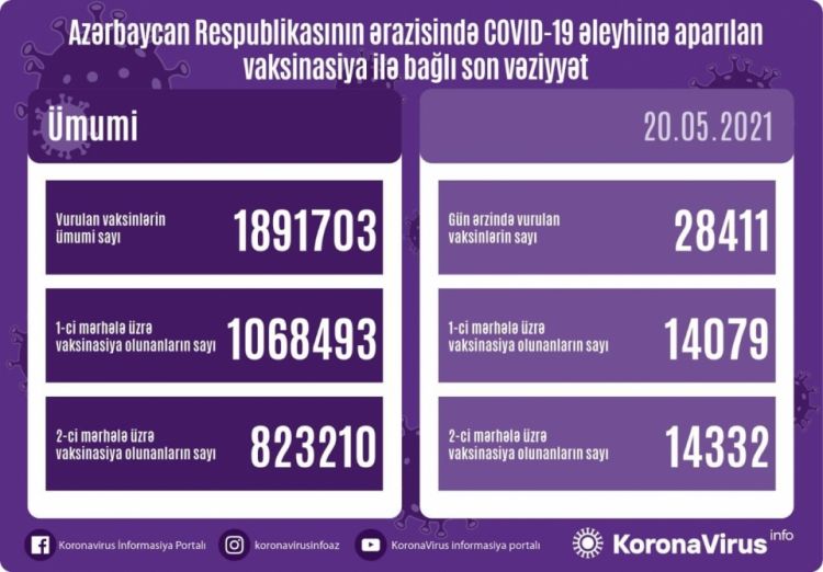 Mayın 20-də Azərbaycanda yeni koronavirus (COVID-19) infeksiyasına qarşı 28 min 411 doza vaksin vurulub.