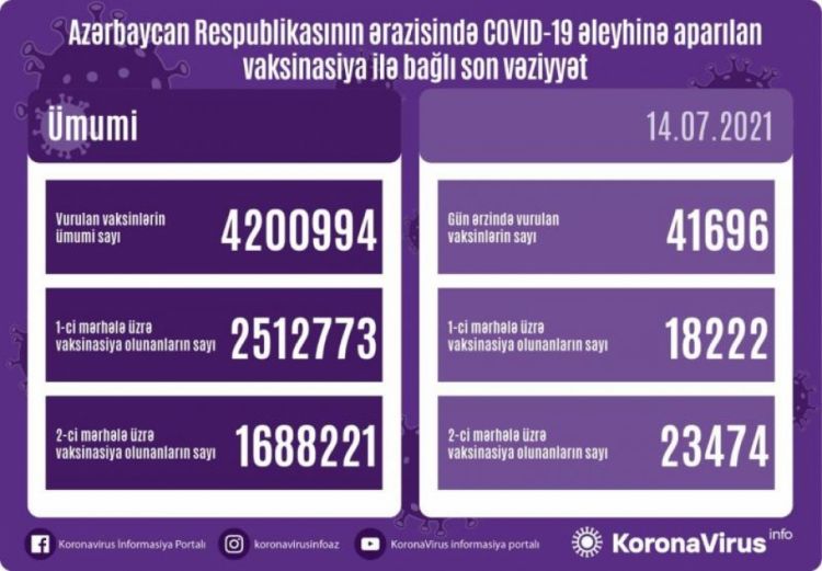 İyulun 14-də Azərbaycanda yeni koronavirus (COVID-19) infeksiyasına qarşı 41 min 696 doza vaksin vurulub.