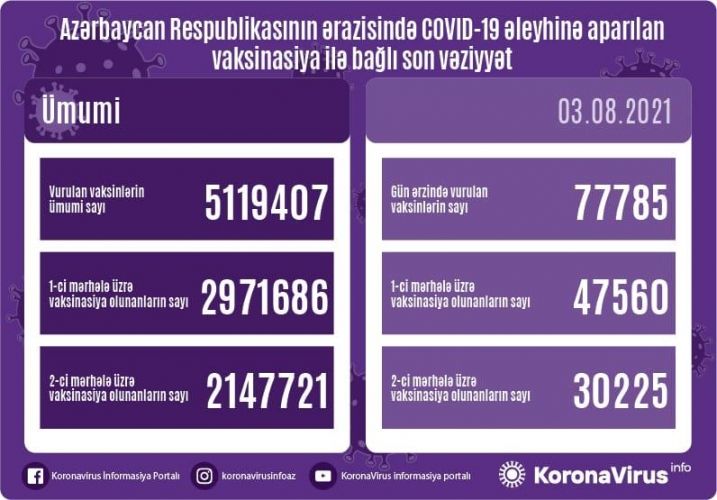 Avqustun 3-də Azərbaycanda yeni növ koronavirus (COVID-19) infeksiyasına qarşı 77 min 785 doza vaksin vurulub.