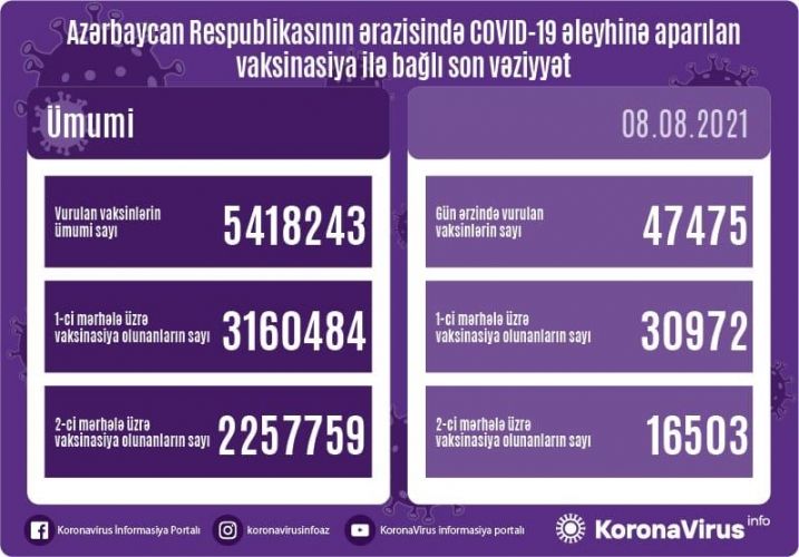 Avqustun 8-də Azərbaycanda yeni növ koronavirus (COVID-19) infeksiyasına qarşı 47 min 475 doza vaksin vurulub.