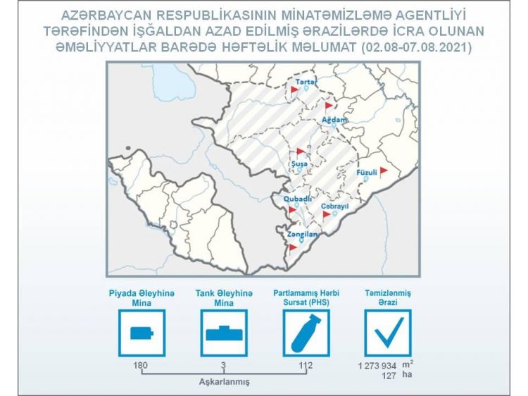 ANAMA-dan NUHÇIXAN İnformasiya Agentliyinə verilən məlumata görə, avqustun 2-dən 8-dək Tərtər, Ağdam, Füzuli, Şuşa, Qubadlı, Cəbrayıl və Zəngilan rayonlarının ərazilərində aparılmış əməliyyat-axtarış tədbirləri zamanı piyada əleyhinə 180, tank əleyhinə 3 mina və 112 ədəd partlamamış hərbi sursat aşkarlanıb.