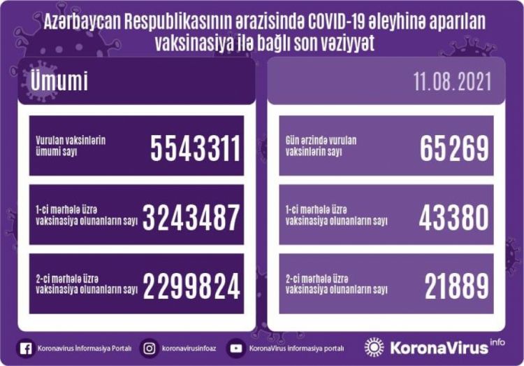 Azərbaycanda bu günə qədər vurulan vaksinlərin ümumi sayı 5 milyon 543 min 311, birinci mərhələ üzrə peyvənd olunanların ümumi sayı 3 milyon 243 min 487, ikinci mərhələ üzrə vaksinasiya edilənlərin sayı 2 milyon 299 min 824 nəfər təşkil edir.