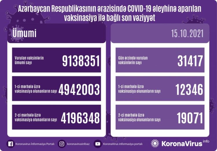 Azərbaycanda bu günə qədər vurulan vaksinlərin ümumi sayı 9 milyon 138 min 351, birinci mərhələ üzrə peyvənd olunanların ümumi sayı 4 milyon 942 min 3, ikinci mərhələ üzrə vaksinasiya edilənlərin sayı 4 milyon 196 min 348 nəfər təşkil edir.