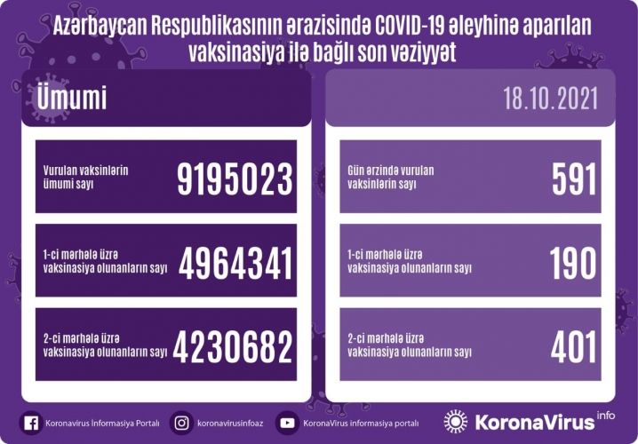 Oktyabrın 18-də Azərbaycanda 591 nəfər yeni növ koronavirus (COVID-19) infeksiyası əleyhinə vaksinasiya olunub.