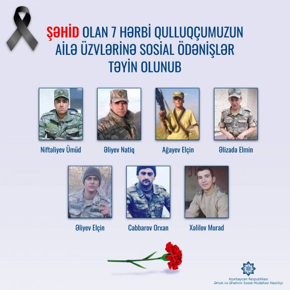 Noyabrın 16-da dövlət sərhədində Ermənistanın təxribatları nəticəsində baş verən döyüş əməliyyatları zamanı Azərbaycan Ordusunun şəhid olan 7 hərbi qulluqçusunun ailələri sosial dəstək tədbirləri ilə əhatə olunub.
