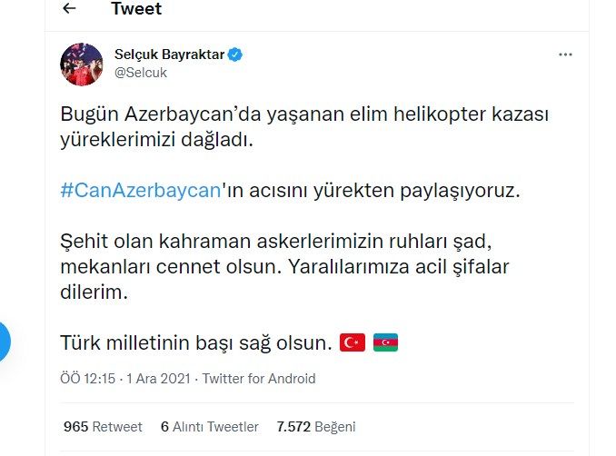 Türk millətinin başı sağ olsun”, - Selçuk Bayraktar sosial şəbəkə hesabında qeyd edib.