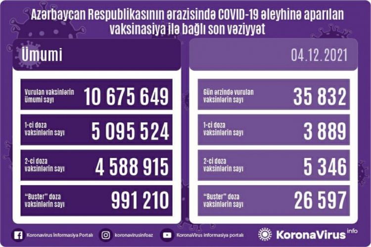 Ölkədə vurulan vaksinlərin ümumi sayı 10 675 649, birinci mərhələ üzrə vaksinasiya olunanların ümumi sayı 5 095 524, ikinci mərhələ üzrə vaksinasiya olunanların sayı 4 588 915, buster doza üzrə vaksinasiya olunanların sayı isə 991 210 təşkil edir.