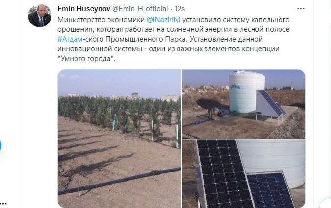 NUHÇIXAN İnformasiya Agentliyi xəbər verir ki, bunu Qarabağ iqtisadi rayonuna daxil olan işğaldan azad edilmiş ərazilərdə (Şuşa rayonu istisna olmaqla) Azərbaycan Respublikası Prezidentinin xüsusi nümayəndəsi Emin Hüseynov öz rəsmi tvitter hesabında yazıb.