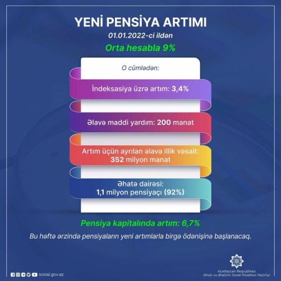 Pensiyaların 2022-ci ilin əvvəlindən indeksləşdirilərək artırılması və maddi yardım verilməsi pensiyaçıların 92 faizini və ya 1,1 milyon nəfəri əhatə edəcək və bu məqsədlər üçün il ərzində əlavə olaraq 352 milyon manat xərclənəcək.