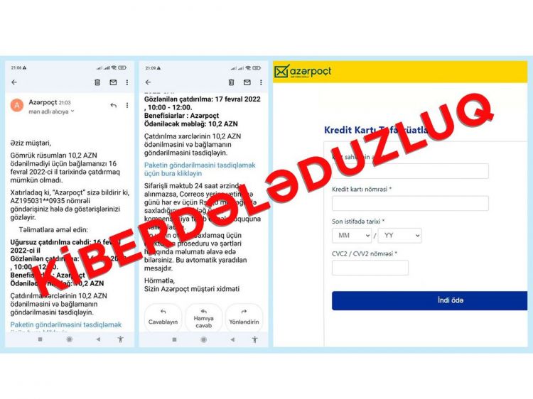 Daha sonra vətəndaş “Azərpoçt” MMC adına açılan saxta sayta yönləndirilir və ondan kart hesabının məlumatları istənilir. Kart məlumatları təqdim edildikdə isə hesabda olan vəsait kiberdələduzların əlinə keçir.