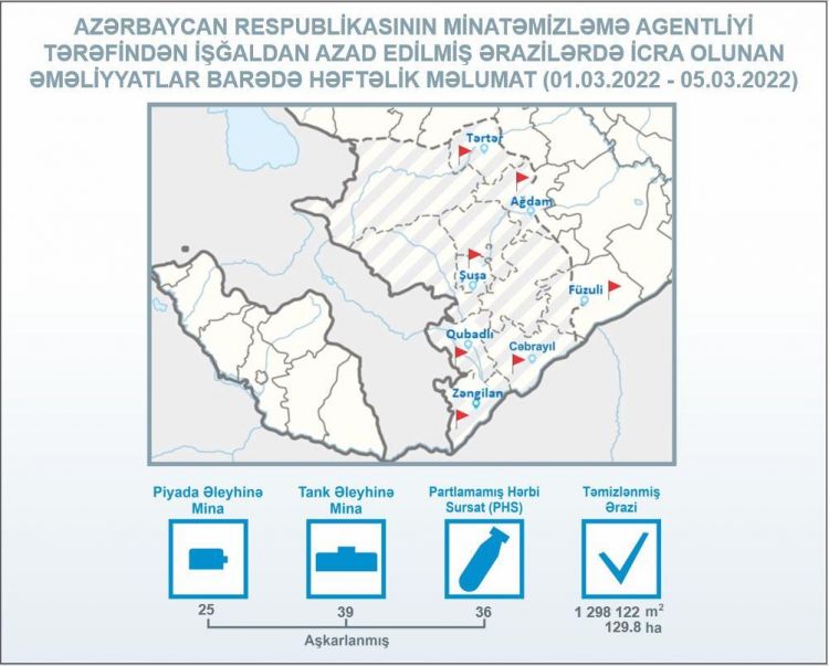ANAMA-dan NUHÇIXAN İnformasiya Agentliyinə verilən məlumata görə, martın 1-dən 5-dək Tərtər, Ağdam, Füzuli, Şuşa, Qubadlı, Cəbrayıl və Zəngilanda aparılan minatəmizləmə əməliyyatları zamanı piyada əleyhinə 25, tank əleyhinə 39 mina və 36 partlamamış hərbi sursat aşkarlanaraq zərərsizləşdirilib.