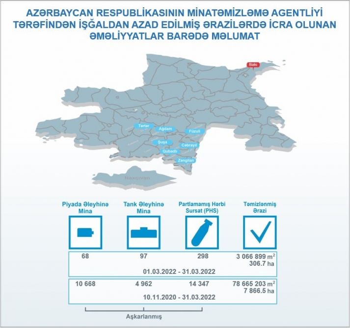 2020-ci il noyabrın 10-dan bu il martın 31-dək isə piyada əleyhinə 10 min 668, tank əleyhinə 4962 mina və 14 min 347 ədəd partlamamış hərbi sursat aşkarlanıb.