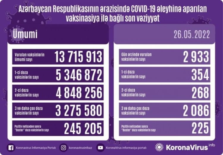 Azərbaycanda bu günə qədər vurulan vaksinlərin ümumi sayı 13 milyon 715 min 913, birinci mərhələ üzrə vurulan peyvəndlərin ümumi sayı 5 milyon 346 min 872, ikinci mərhələ üzrə 4 milyon 848 min 256, üç və daha çox doza vaksinlərin sayı 3 milyon 275 min 580, pozitiv nəticədən sonra “buster” doza vaksinlərin sayı 245 min 205-dir.