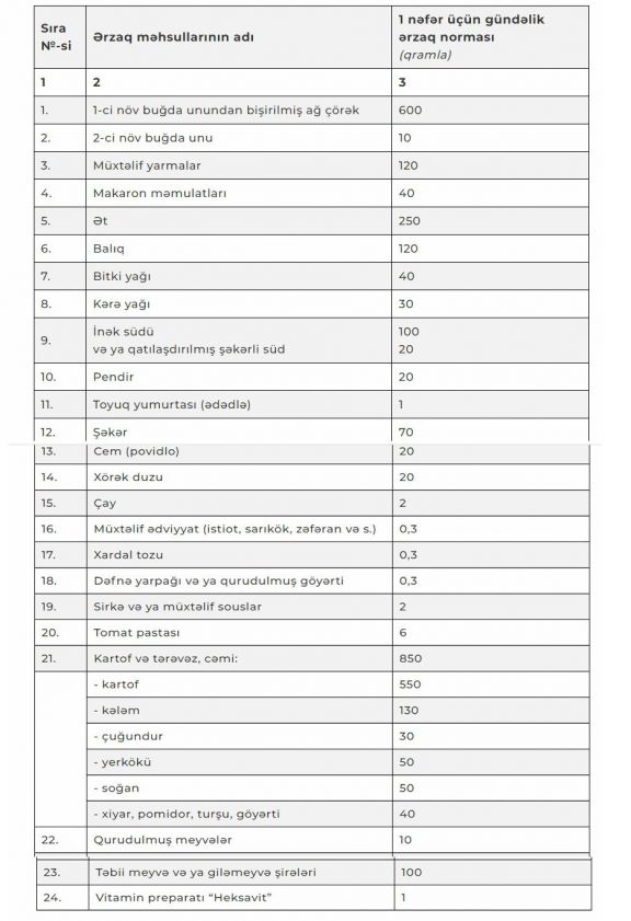 Dəyişikliyə əsasən, Azərbaycan Ordusunun əməliyyat (komando) briqadalarının ərzaq payı normaları Daxili İşlər Nazirliyinin xüsusi təyinatlı dəstələrinin ərzaq payı normalarına uyğun müəyyənləşib.