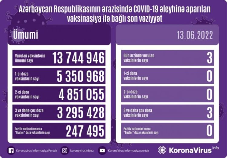 İyunun 13-də Azərbaycanda yeni növ koronavirus (COVID-19) infeksiyası əleyhinə 3 doza vaksin vurulub.