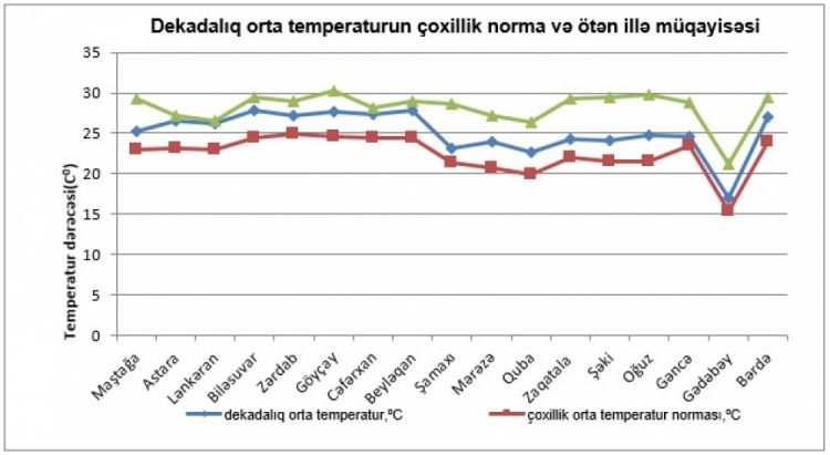 Ekologiya və Təbii Sərvətlər Nazirliyinin Milli Hidrometeorologiya Xidmətindən NUHÇIXAN İnformasiya Agentliyinə verilən məlumata görə, havanın dekadalıq orta temperaturu paytaxt üzrə Maştağada 25.2º, Naxçıvanda 25.5º, Mil-Muğan, Mərkəzi Aran və Qarabağ bölgələrində 26-28º, Lənkəran-Astarada 26-28 º, Gəncə-Daşkəsəndə 25-26º, Dağlıq Şirvan bölgəsində 23-24º, Şəki-Zaqatalada 24-25º, Qubada 22.7º, Qazax-Tovuzda 17-24º təşkil edib.