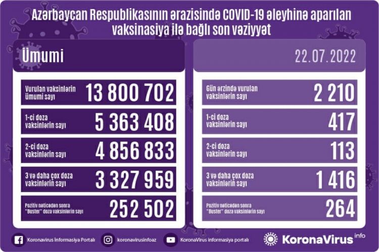 İyulun 22-də Azərbaycanda yeni növ koronavirus (COVID-19) infeksiyası əleyhinə 2210 doza vaksin vurulub.