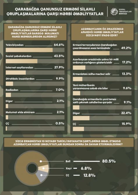 Yekun nəticələrə əsasən, respondentlərin mütləq əksəriyyəti Azərbaycanın öz ərazisində qanunsuz erməni silahlı qruplaşmalarına qarşı apardığı hərbi əməliyyatlar barədə məlumatlıdır. Respondentlərin 64,6 faizi bu barədə məlumatı televiziyadan əldə etdiyini bildirib. Müvafiq istiqamətdə məlumat mənbələri sırasında 43,5 faiz göstərici ilə sosial şəbəkələr ikinci pillədə yer alıb. Təqribən 27,9 faiz bu barədə məlumatı internet saytlarından əldə etdiyini bildirib.