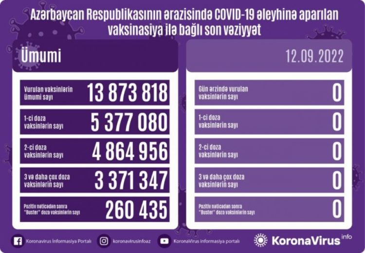 Nazirlər Kabineti yanında Operativ Qərargahdan NUHÇIXAN İnformasiya Agentliyinə bildirilib ki, Azərbaycanda bu günə qədər vurulan vaksin dozalarının ümumi sayı 13 milyon 873 min 818, birinci mərhələ üzrə vurulan peyvənd dozalarının ümumi sayı 5 milyon 377 min 80, ikinci mərhələ üzrə 4 milyon 864 min 956, üç və daha çox doza vaksinlərin sayı 3 milyon 371 min 347, pozitiv nəticədən sonra “buster” doza vaksinlərin sayı 260 min 435-dir.