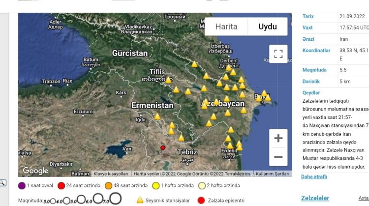 Azərbaycan Milli Elmlər Akademiyası nəzdində Respublika Seysmoloji Xidmət Mərkəzindən NUHÇIXAN İnformasiya Agentliyinə bildirilib ki, sentyabrın 21-də yerli vaxtla saat 21:57-də Naxçıvan stansıyasından 78 km cənub-qərbdə İran ərazisində zəlzələ qeydə alınıb. Zəlzələ Naxçıvan Muxtar respublikasında 4,3 bala qədər hiss olunub.