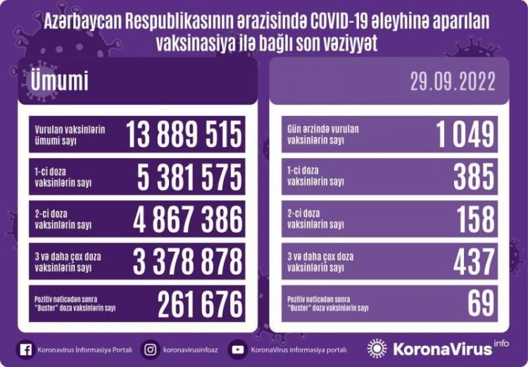 Vurulan vaksinlərin ümumi sayı 13 889 515, birinci mərhələ üzrə vaksinasiya olunanların ümumi sayı 5 381 575, ikinci mərhələ üzrə vaksinasiya olunanların sayı 4 867 386, üç və daha çox doza üzrə vaksinasiya olunanların sayı 3 378 878, pozitiv nəticədən sonra buster doza üzrə vaksinasiya olunanların sayı isə 261 676 nəfər təşkil edir.