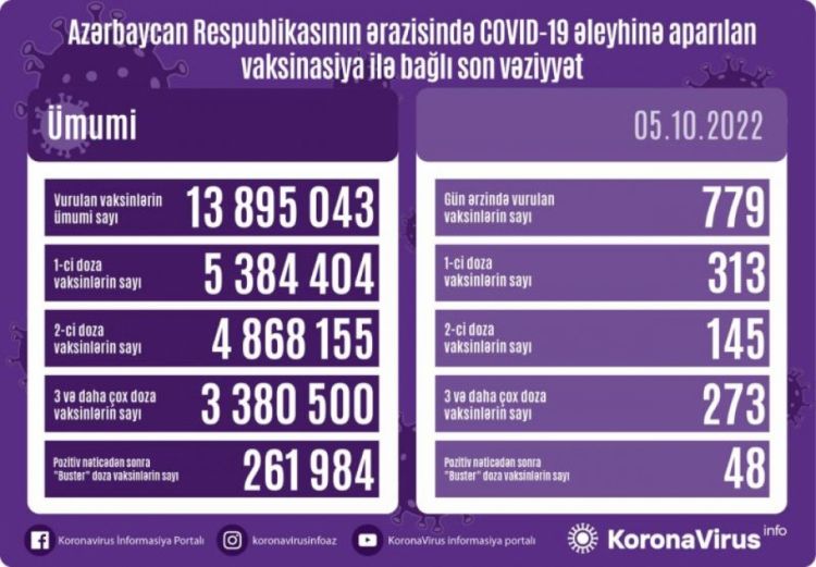 Oktyabrın 5-də Azərbaycanda yeni növ koronavirus (COVID-19) infeksiyası əleyhinə 779 doza vaksin vurulub.