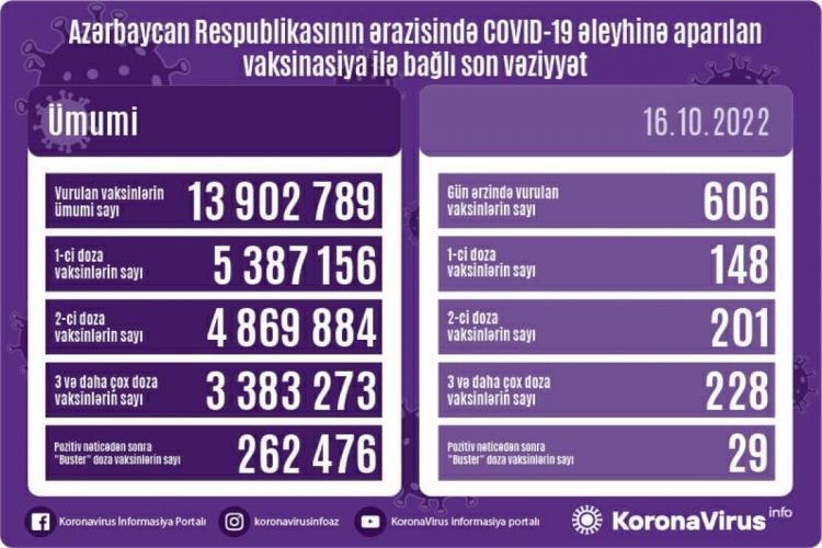 Oktyabrın 16-da Azərbaycanda yeni növ koronavirus (COVID-19) infeksiyası əleyhinə 606 doza vaksin vurulub.