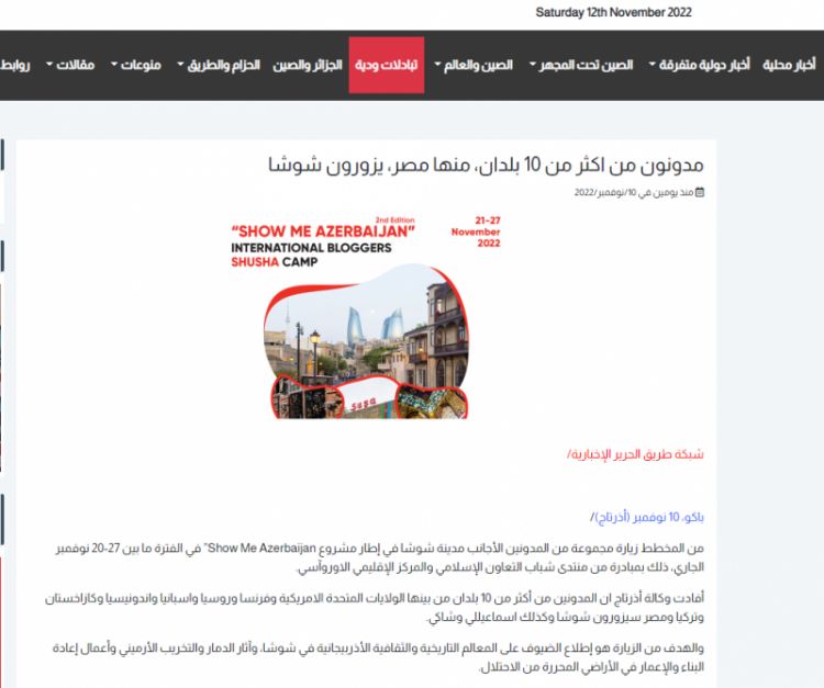 Əlcəzairin “Əl Hərir” informasiya portalında bir qrup əcnəbi blogerin Şuşaya səfər edəcəyi barədə xəbər yayımlanıb.
