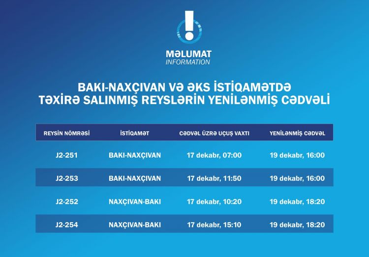 Belə ki, Bakı-Naxçıvan marşrutu üzrə dekabrın 17-nə planlaşdırılan J2-251 (saat 07:00) və J2-253 (saat 11:50) nömrəli reyslər dekabrın 19-u yerli vaxt ilə saat 16:00-da həyata keçiriləcək. Bununla yanaşı, Naxçıvan-Bakı marşrutu üzrə dekabrın 17-nə planlaşdırılan J2-252 (saat 10:20) və J2-254 (saat 15:10) nömrəli reyslər bu gün yerli vaxt ilə saat 18:20-də həyata keçiriləcək.