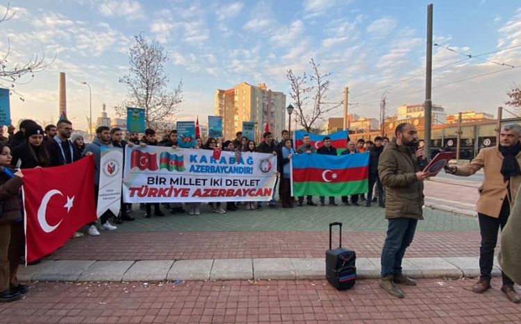 Sonra Eskişehir Azərbaycanlılar Dərnəyinin gənclər qanadının sədri Zahir Hacızadə aksiya iştirakçılarının bəyanatını oxuyub.