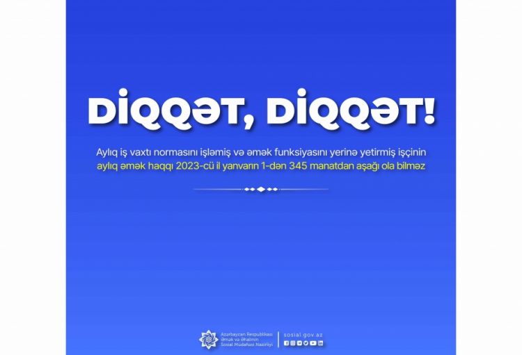 Nazirliyin İctimaiyyətlə əlaqələr şöbəsindən NUHÇIXAN İnformasiya Agentliyinə bildirilib ki, aylıq iş vaxtı normasını işləmiş və əmək funksiyasını yerinə yetirmiş işçinin aylıq əmək haqqı 2023-cü il yanvarın 1-dən 345 manatdan aşağı ola bilməz.
