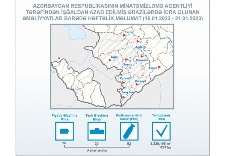 ANAMA-dan NUHÇIXAN İnformasiya Agentliyinə bildiriblər ki, yanvarın 16-dan 21-dək Tərtər, Ağdam, Laçın, Xocavənd, Şuşa, Füzuli, Qubadlı, Cəbrayıl və Zəngilan rayonlarının ərazilərində aparılmış minatəmizləmə əməliyyatları zamanı piyada əleyhinə 15, tank əleyhinə 20 mina və 93 partlamamış hərbi sursat aşkarlanaraq zərərsizləşdirilib.