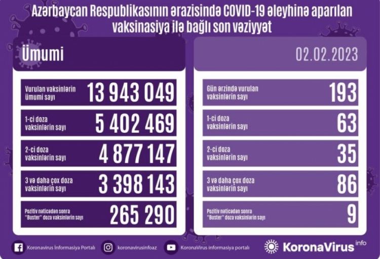 Azərbaycanda bu günə qədər vurulan vaksin dozalarının ümumi sayı 13 milyon 943 min 49, birinci mərhələ üzrə vurulan peyvənd dozalarının ümumi sayı 5 milyon 402 min 469, ikinci mərhələ üzrə 4 milyon 877 min 147, üç və daha çox doza vaksinlərin sayı 3 milyon 398 min 143, pozitiv nəticədən sonra “buster” doza vaksinlərin sayı 265 min 290-dır.