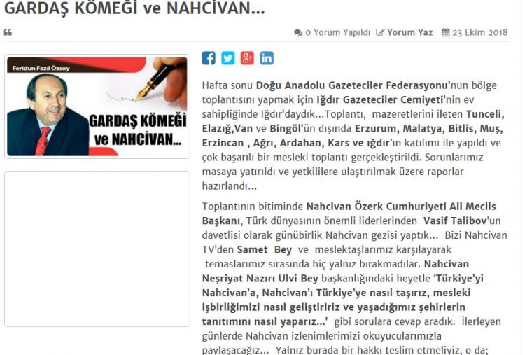 Şərqi Anadolu Jurnalistlər Cəmiyyətinin sədri Feridun Fazıl Özsoyun Ərzurumda nəşr olunan “Pusula” qəzetində “Qardaş köməyi və Naxçıvan” sərlövhəli məqaləsi dərc olunmuş, eyni zamanda həmin məqalə qəzetin gazetepusula.net internet saytında yerləşdirilmişdir. Həmçinin Ağrı Jurnalistlər Cəmiyyətinin sədri Ələddin Aslanın "Narınqala" qəzetində və qəzetin narınkalegazetesi.net saytında "Heyranedici Naxçıvan" adlı məqaləsi dərc olunub. Hər iki məqaləni təqdim edirik.