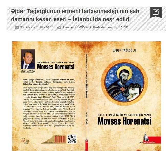NUHÇIXAN xəbər verir ki, bu günlərdə Türkiyədə Doğu Kütüphanesi (İstanbul) nəşriyyatında Turan Araşdırma Mərkəzi ictimai birliyinin sədri, filoloq-tarixçi, ictimai-siyasi xadim, türkçü alim professor Əjdər Tağıoğlunun (İsmayılovun) “Erməni xalqının saxta “tarixi” üç türk dövlətinin (Biaini, Arme, Part/Parfya) mifoloji və filoloji tarixidir” seriyasından erməni “tarixşünaslığı”nın şah damarını kəsən əsəri, “Moisey Xorenatsi anonim keşiş müəllifdir” adında kitabı anadolu türkçəsində “Sahte ermeni tarihi ve sahte keşiş yazar Movses Horenatsi” adı ilə çapdan çıxıb.