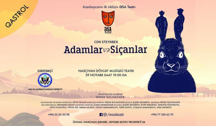NUHÇIXAN AZƏRTAC-a istinadən xəbər verir ki, amerikalı yazıçı, Nobel mükafatı laureatı Con Steynbekin “Siçanlar və insanlar haqqında” povesti əsasında hazırlanan tamaşanın nümayişi ABŞ-ın ölkəmizdəki səfirliyinin dəstəyi ilə noyabrın 29-da baş tutacaq.