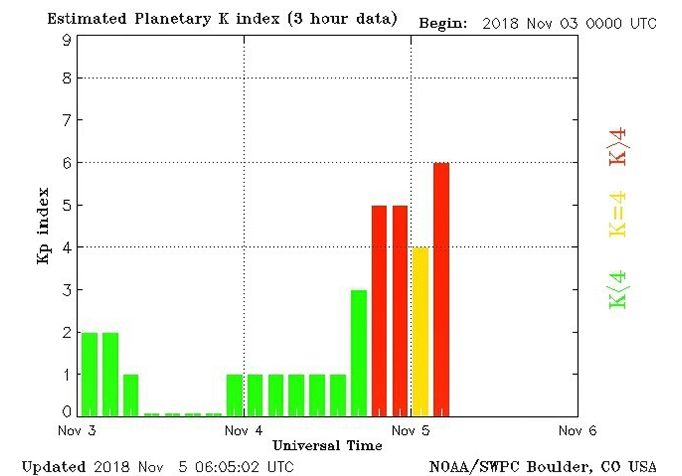 Bu gün geomaqnit sahədə qasırğa səbəbi G1-G2 (Minor - Moderate) səviyyəsinə qədər qalxacaq. Sabah bu qasırğa səviyyəsinin davam edəcəyi, noyabrın 7-də isə nisbətən zəifləyəcəyi gözlənilir. Lakin həmin gün fasilələrlə həyəcanlanmaların olacağı istisna olunmur.