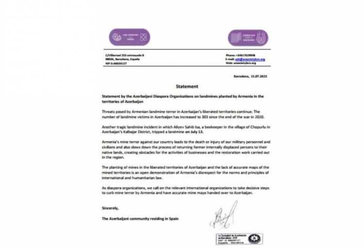 İspaniya azərbaycanlıları Ermənistanın mina problemi ilə bağlı yolverilməz davranışını beynəlxalq hüquq norma və prinsiplərinə hörmətsizliyin açıq nümayişi adlandırıblar. Beynəlxalq təşkilatları mina sahələrinin dəqiq xəritələrini ölkəmizə təqdim etməsi, BMT-nin Minalardan Təmizləmə Xidməti (UNMAS) kimi minalarla mübarizə aparan beynəlxalq təşkilatlarla çalışması üçün Ermənistana güclü təzyiq göstərməyə çağırıblar.