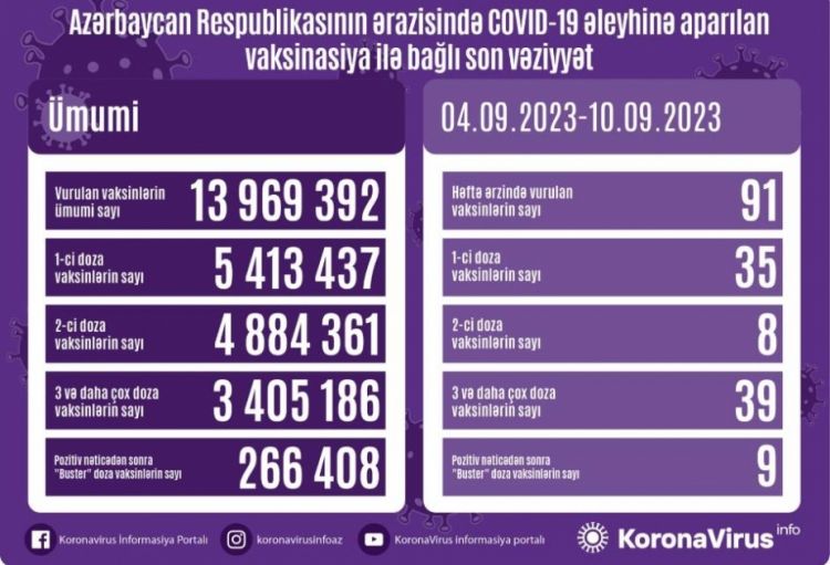 Sentyabrın 4-dən 10-dək Azərbaycanda yeni növ koronavirus (COVID-19) infeksiyası əleyhinə 91 doza vaksin vurulub.
