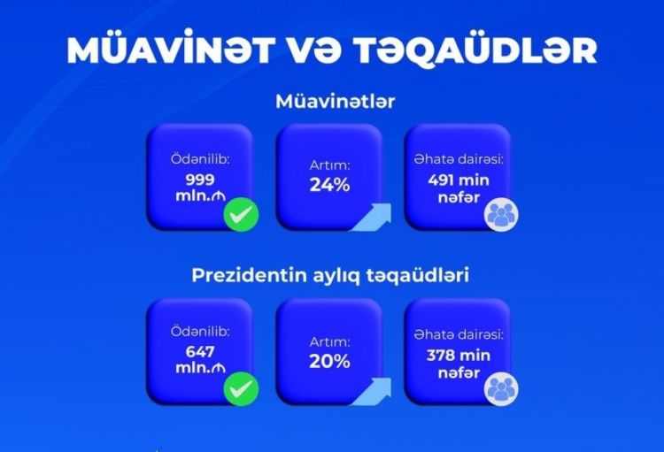Nazirliyin İctimaiyyətlə əlaqələr şöbəsindən NUHÇIXAN-a verilən məlumata görə, sosial müavinətlər üzrə 24 faiz çox olmaqla 999 milyon manat, Prezident təqaüdləri üzrə 20 faiz çox olmaqla 647 milyon manat ödənilib.