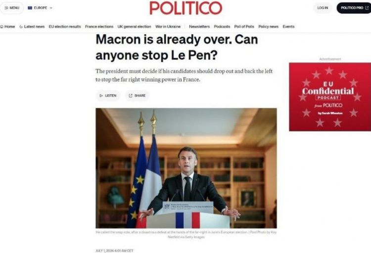 Birləşmiş Ştatların nüfuzlu “Politico” nəşrində “Makronun dövrü başa çatdı. Le Peni kimsə dayandıra biləcəkmi?” sərlövhəli məqalə dərc edilib.