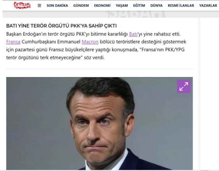Qəzet yazır ki, Fransa Suriyada terrorçulara himayədarlıq edən yeganə Avropa ölkəsi deyil. “Qərbin terrorizmə sevgisi səngimək bilmir. Hələ Fransa Prezidentindən əvvəl Berlində YPG/PKK-ya dəstək elan edilmişdi”, - deyə “Sabah” Almaniyanın xarici işlər naziri Annalena Berbokun Suriyadakı vəziyyətlə bağlı açıqlamalarına diqqət çəkib.
