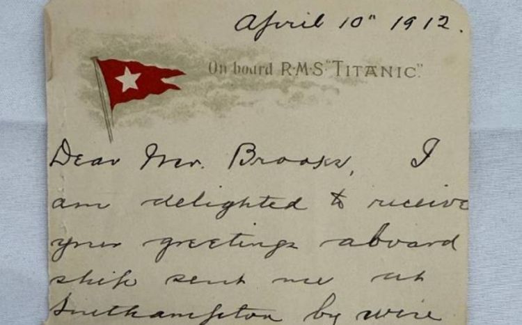 “Titanik”də birinci dərəcəli səyahət edən polkovnik Arçibald Qreys məktubunda gəmi haqqında ilk təəssüratlarını bölüşüb. Məktub kartı 10 aprel 1912-ci il tarixlidir.