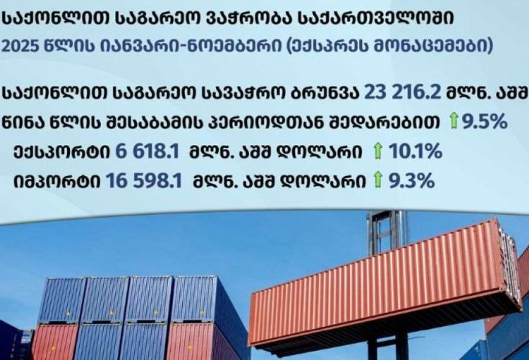 Cari ilin yanvar-noyabr ayları ərzində Gürcüstanın xarici ticarət dövriyyəsi (bəyan edilməmiş ticarət istisna olmaqla) 23 milyard 216,2 milyon dollar təşkil edib. Bu da əvvəlki ilin müvafiq dövrü ilə müqayisədə 9,5 faiz çoxdur.