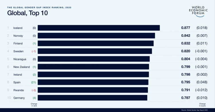 NUHÇIXAN Dünya İqtisadi Forumunun məlumatına istinadla xəbər verir ki, dünya üzrə gender bərabərliyi reytinqində İslandiya yenə birinci yerdədir. Sonrakı yerləri isə, müvafiq surətdə, Norveç, Finlandiya və İsveç tutur.